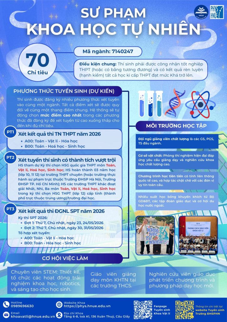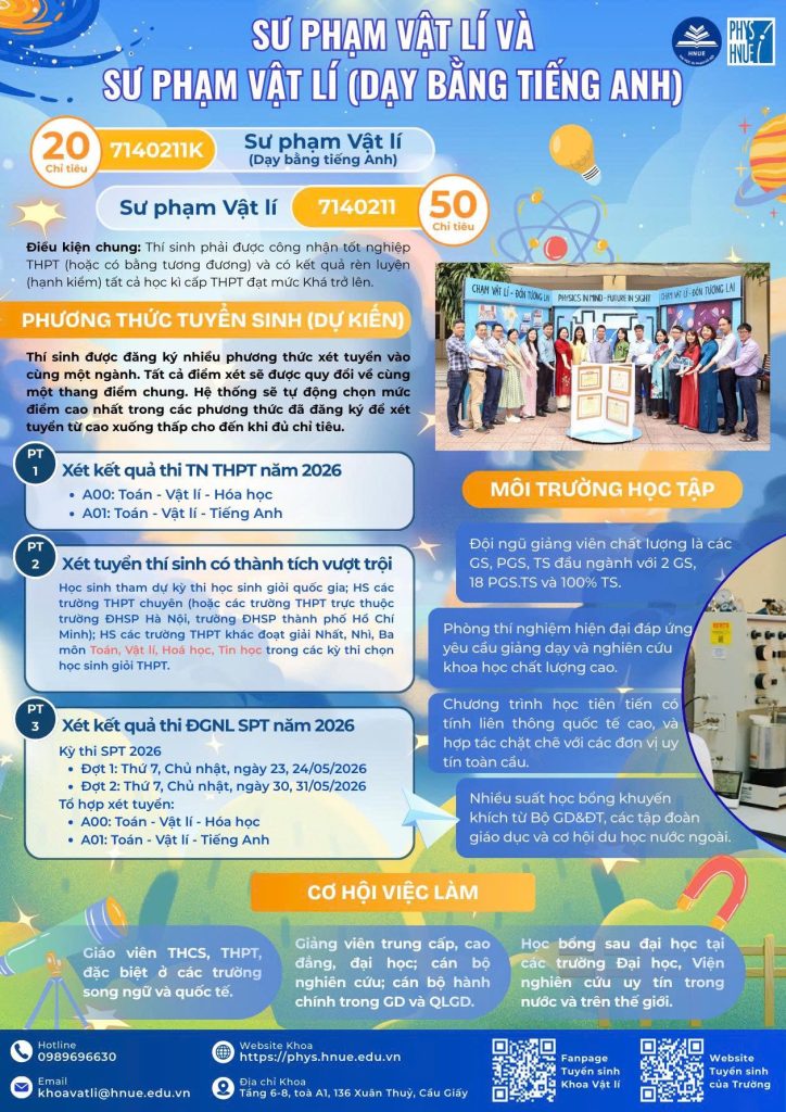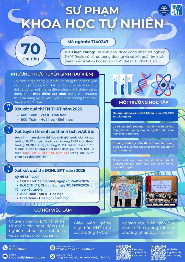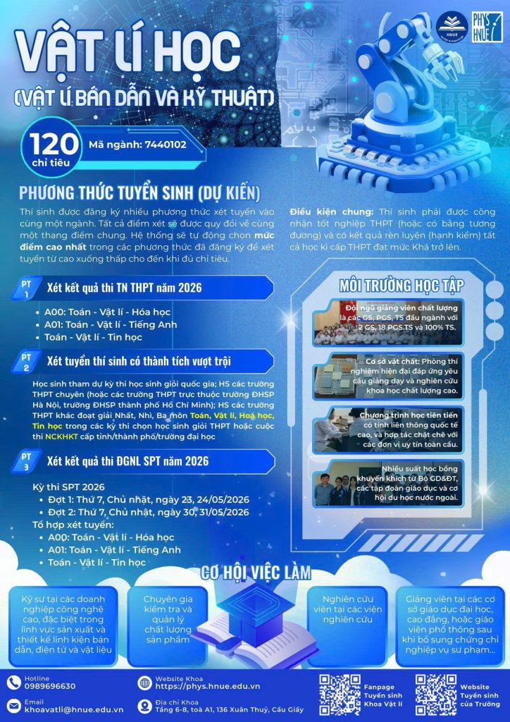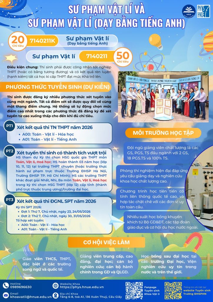 Hành trình chinh phục tri thức đang chờ đón phía trước. Hãy theo dõi Fanpage Tuyển sinh Khoa Vật lí – Trường Đại học Sư phạm Hà Nội để không bỏ lỡ những thông tin quan trọng và cơ hội trở thành sinh viên Khoa Vật lí trong mùa tuyển sinh 2026!